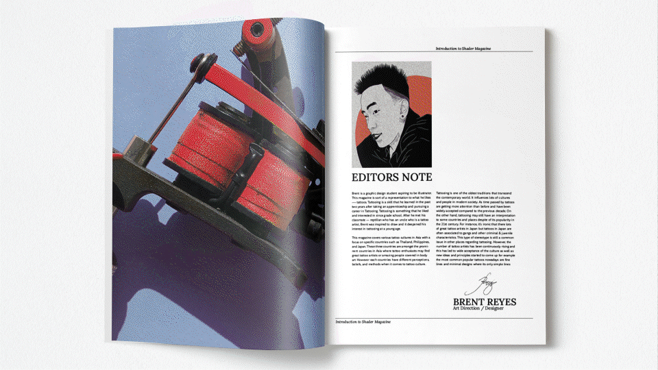 Shader magazine is a tattoo lifestyle publication focusing on tattoo culture specifically in Asia such as Thailand, Japan, and the Philippines. The magazine features tattoo culture in Asia as it explores various tattooing techniques, methods, and designs from these countries. The name “Shader” encompasses different meanings. In tattooing, a shader refers to a type of needle used for soft shading. In addition, the term shader also refers to anything that provides shade aligning its name to the essence of tattooing or body art where Image—Illustration, Design, or Script is engraved to the skin using black ink or color ink covering the skin.